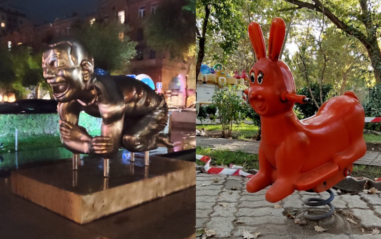 What makes Yerevan great: you can walk central streets and enjoy a multinational crowd much like in London. You can view cultural heritage for free at the foot of Cascade in the Cafesjian Center for the Arts. But in courtyards and playgrounds, masterpieces of no smaller caliber are waiting too.