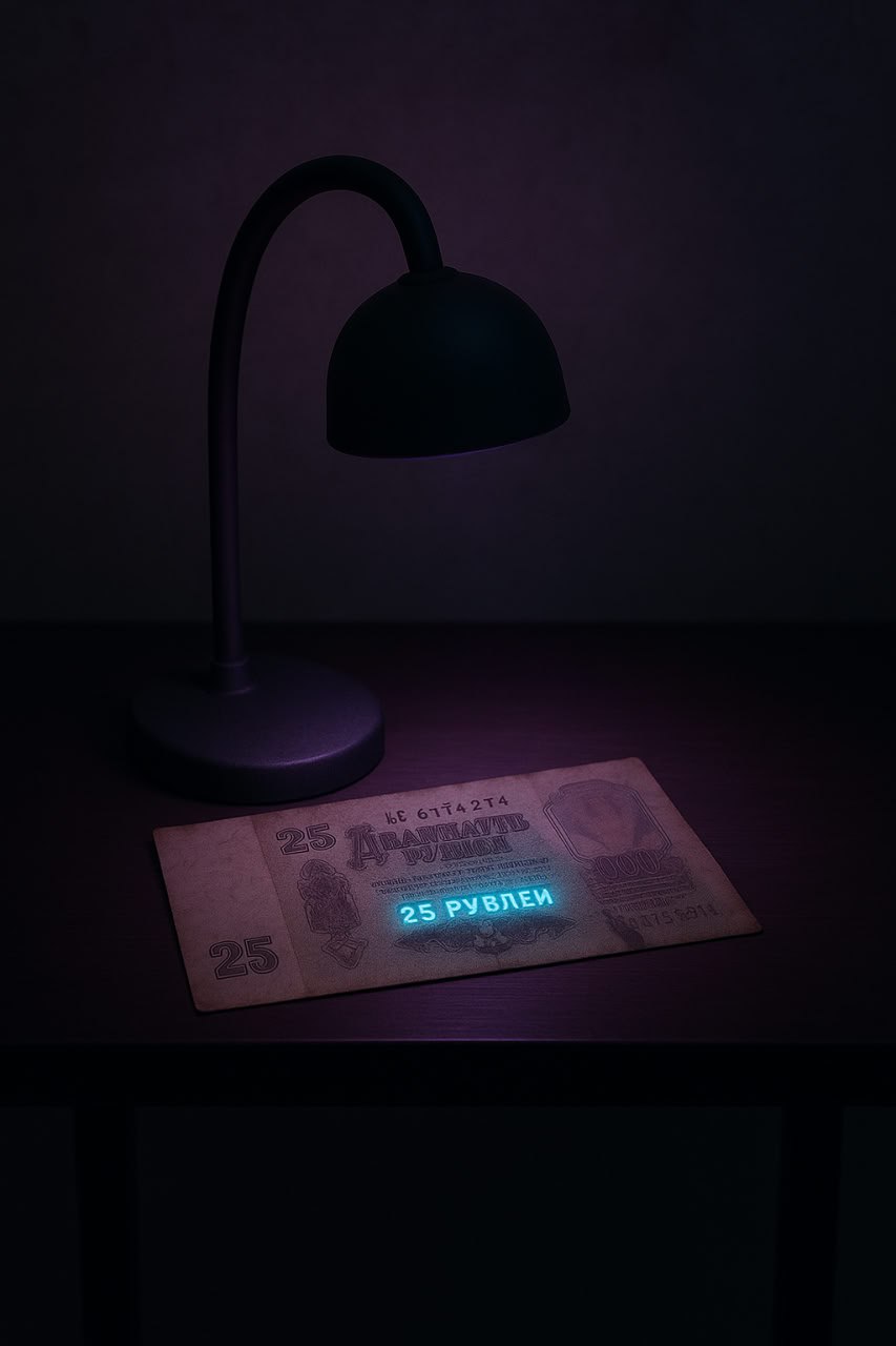 Fizbar was darkened, like a real bar. In that half-darkness one exhibit stood out: an ultraviolet lamp. You could place money under it and watch invisible text appear - "25 rubles" or "50 rubles." The 100-ruble bill glowed entirely with rainbow patterns.