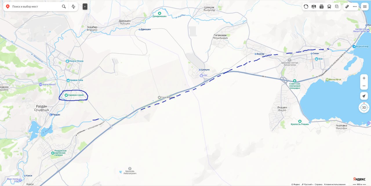Then I looked deeper. Sevan is a giant freshwater mountain lake (only Baikal is larger). Angara flows out of Baikal. Hrazdan flows out of Sevan. But in this area it does not flow freely. On the map, only two river sections are visible; the rest is hidden under the mountain in a tunnel reportedly dug by German POWs. I marked the approximate tunnel route with a dashed line.