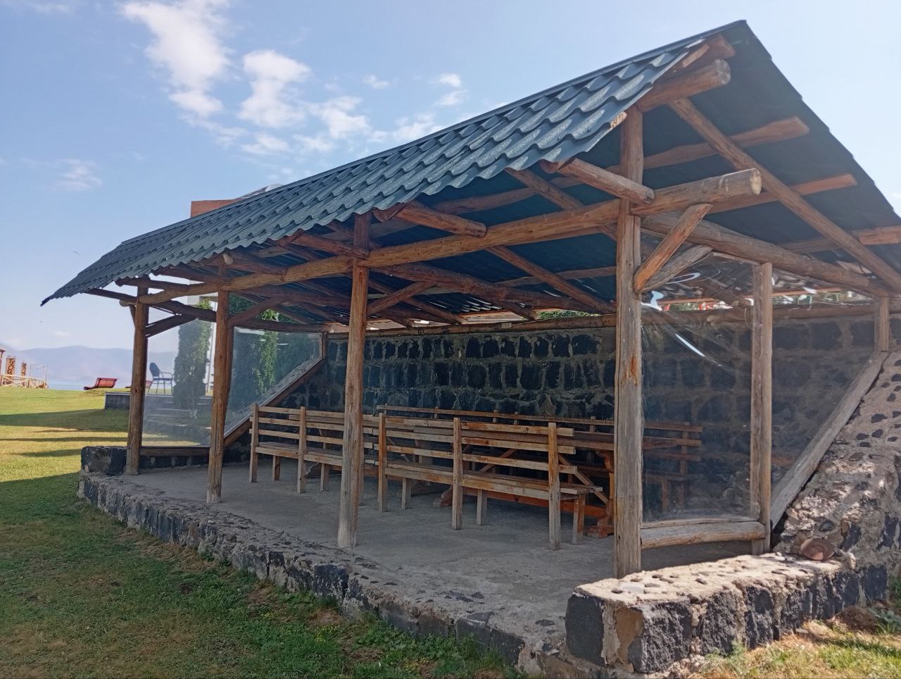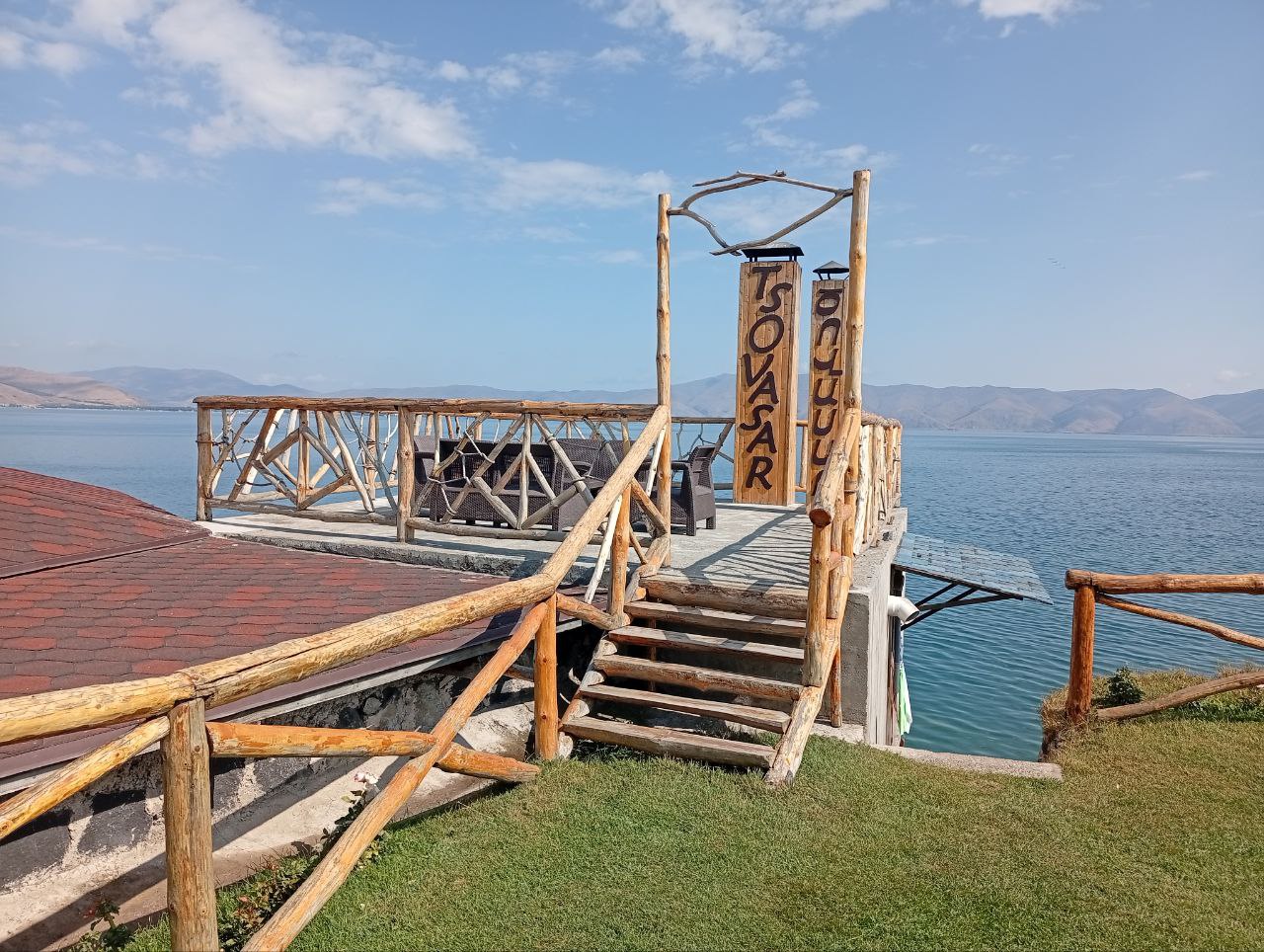 The territory is designed with a lot of imagination. There is a dining hall styled like a Viking ship, a mini-kitchen for barbecue, branded benches with the Tsovasar name, several stairways going down to the water, and a swimming pool. The pool is heated, but in September the heating is already not fully enough.
