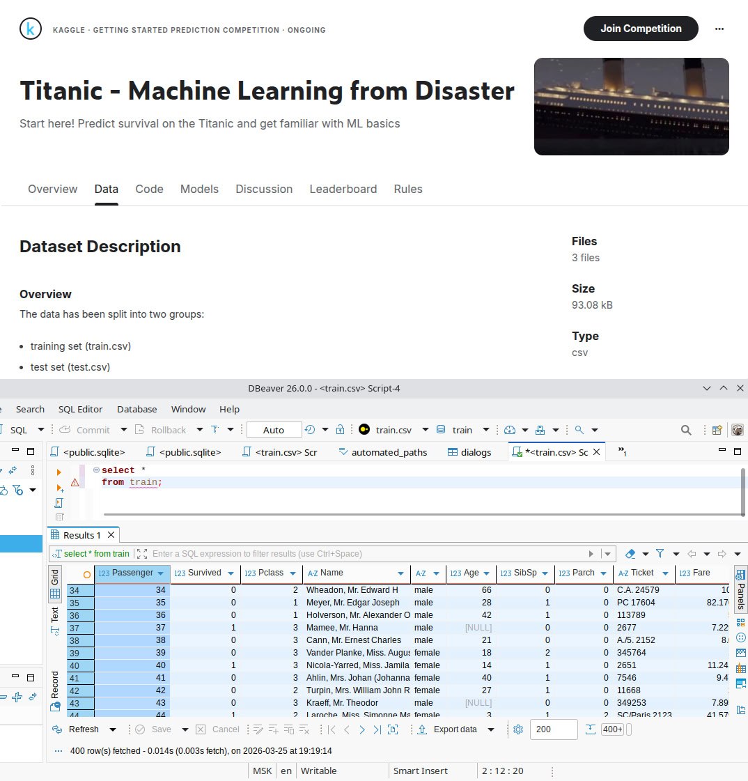 Но чтобы смысл извлекать, какие-то данные нужны. Мы думали-думали и придумали взять датасет Титаник. По современным меркам петабайтов Интернета и Больших Языковых Моделей этот датасет вообще крошка - 891 запись чтобы потренироваться и ещё примерно 400 чтобы потестироваться. Меньше только ирисы Фишера, разве что.