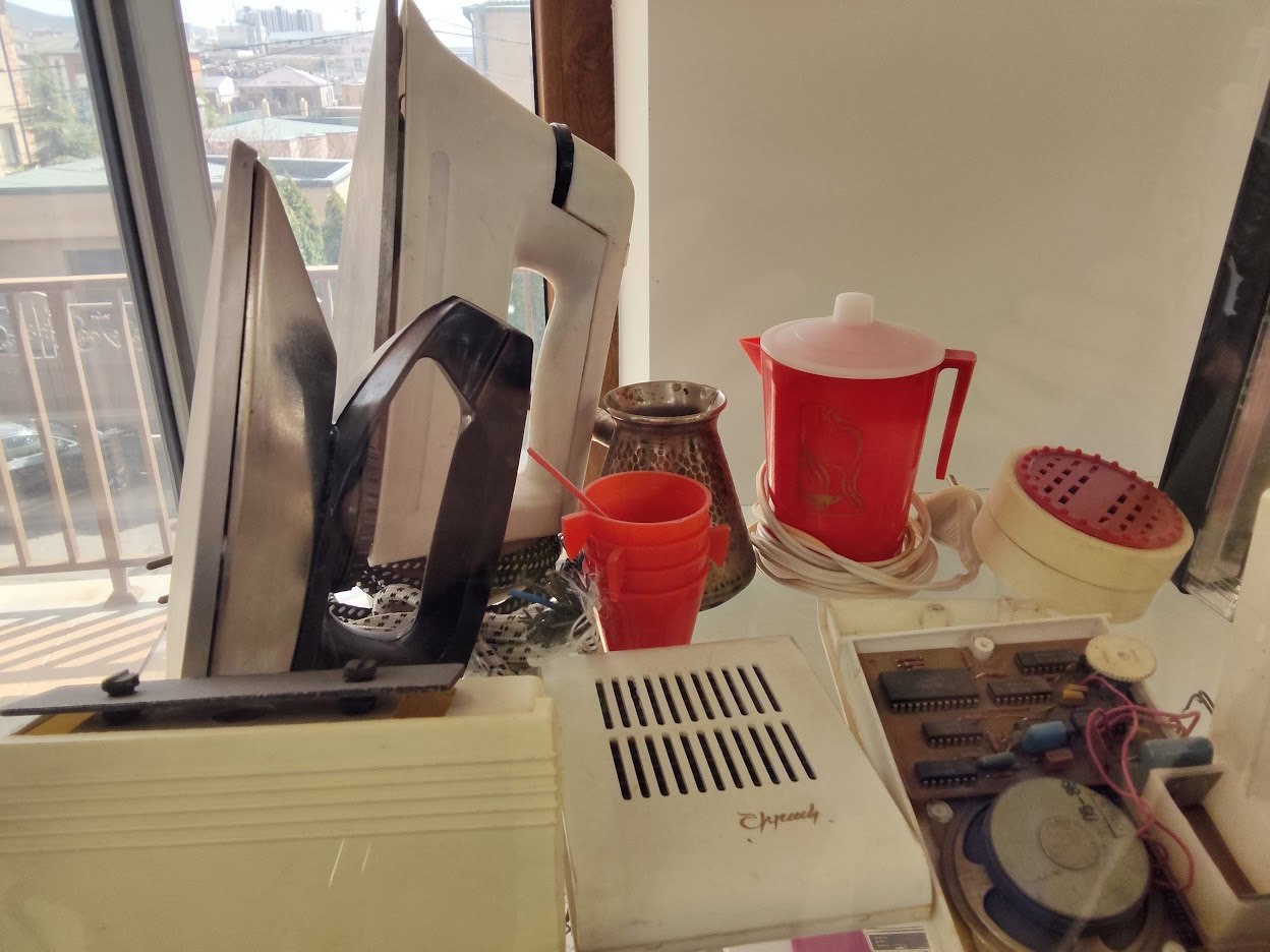 Предметы быта - утюги, кофемолка, кофеварка. В левом нижнем углу дверной звонок, как он был у моих дедушки с бабушкой.