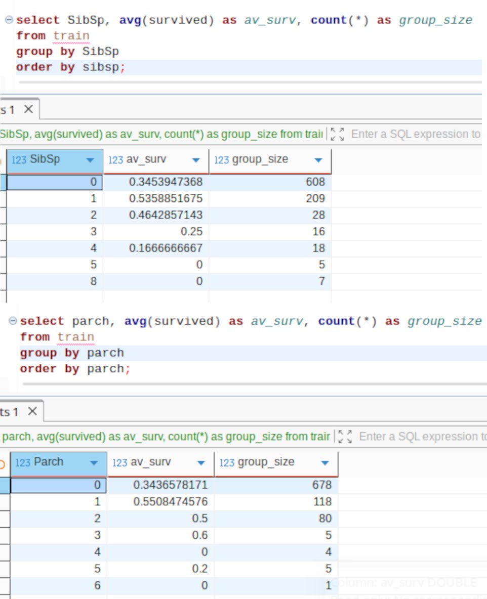 Очень важная вещь: собираем пассажиров в маленькие кучки, так чтобы у всех пассажиров в кучке было одинаковое количество сестёр+братьев+супругов. GROUP BY sibsp